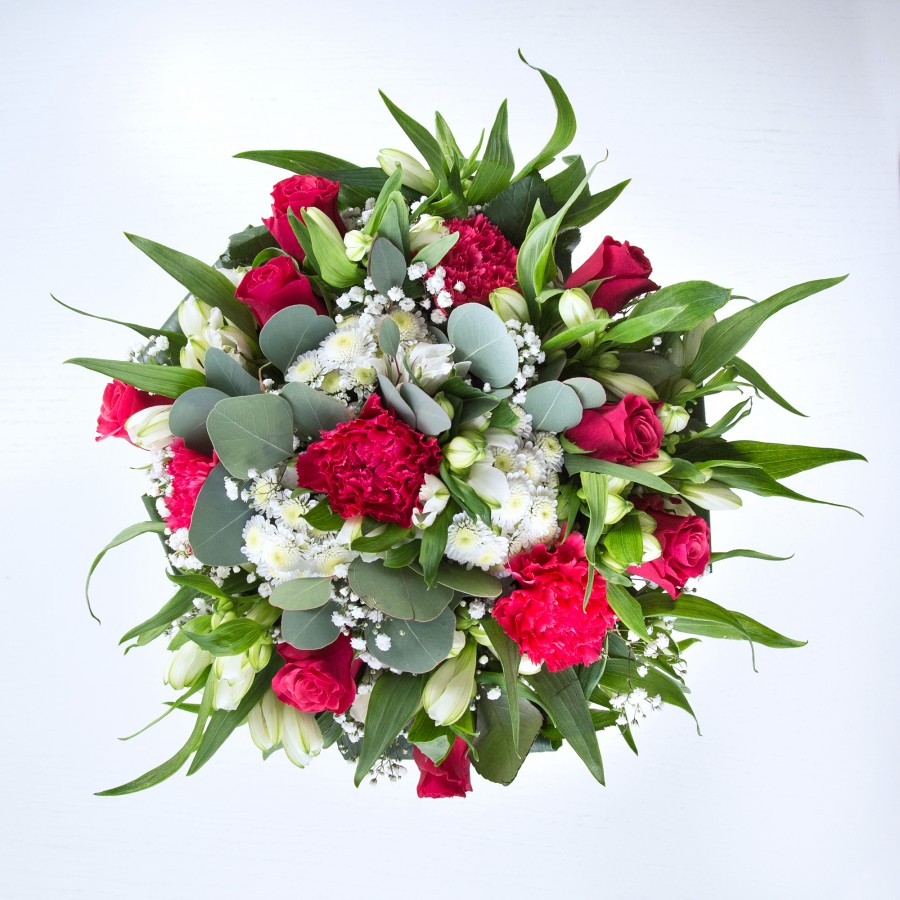 Celebrate love and sophistication with this uniquely designed bouquet. A harmonious blend of vibrant red roses and pristine white chrysanthemums sets the stage for a captivating floral display. Complemented by soft carnations, airy gypsophila, and elegant white alstroemeria, each bloom is encased in a design that exudes luxury and personal touch.